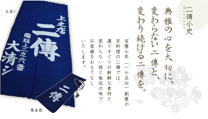二傳の歴史は、宝暦7年(1757年)、初代 傳七が、当時の京都中央市場にあたる、上ノ店市場【かみのたないちば】内(現在の椹木町通油小路西入ル)に、魚屋を開いたところから始まります。店は二条城への出入りを許され、「二条城出入りの傳七」が詰まり、ほどなく屋号を「二傳」と呼ばれるようになります。