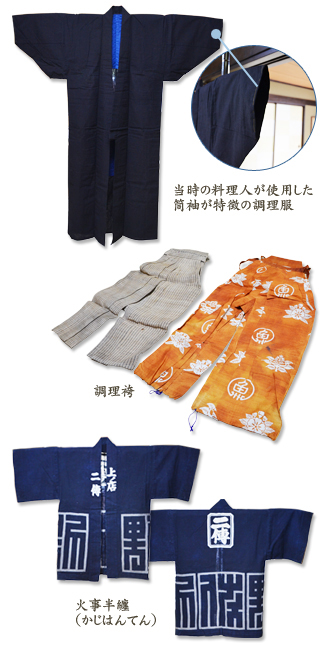 当時は現在のようなガス火設備、排気設備はもちろんありませんので、店舗の最も外側(道路側)に炭火の火口を設けており、その通風口も見てとることができます。また配達に使用する“おかもち”は、写真のように店の軒先に吊るしておくのが、当時の仕出し屋の看板代わりでもありました。