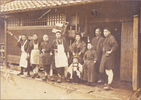 下の写真は大正2年の開店から間もない頃と思われる、店の前で撮影したスタッフの集合写真です。(右端が7代 山田丑太郎)